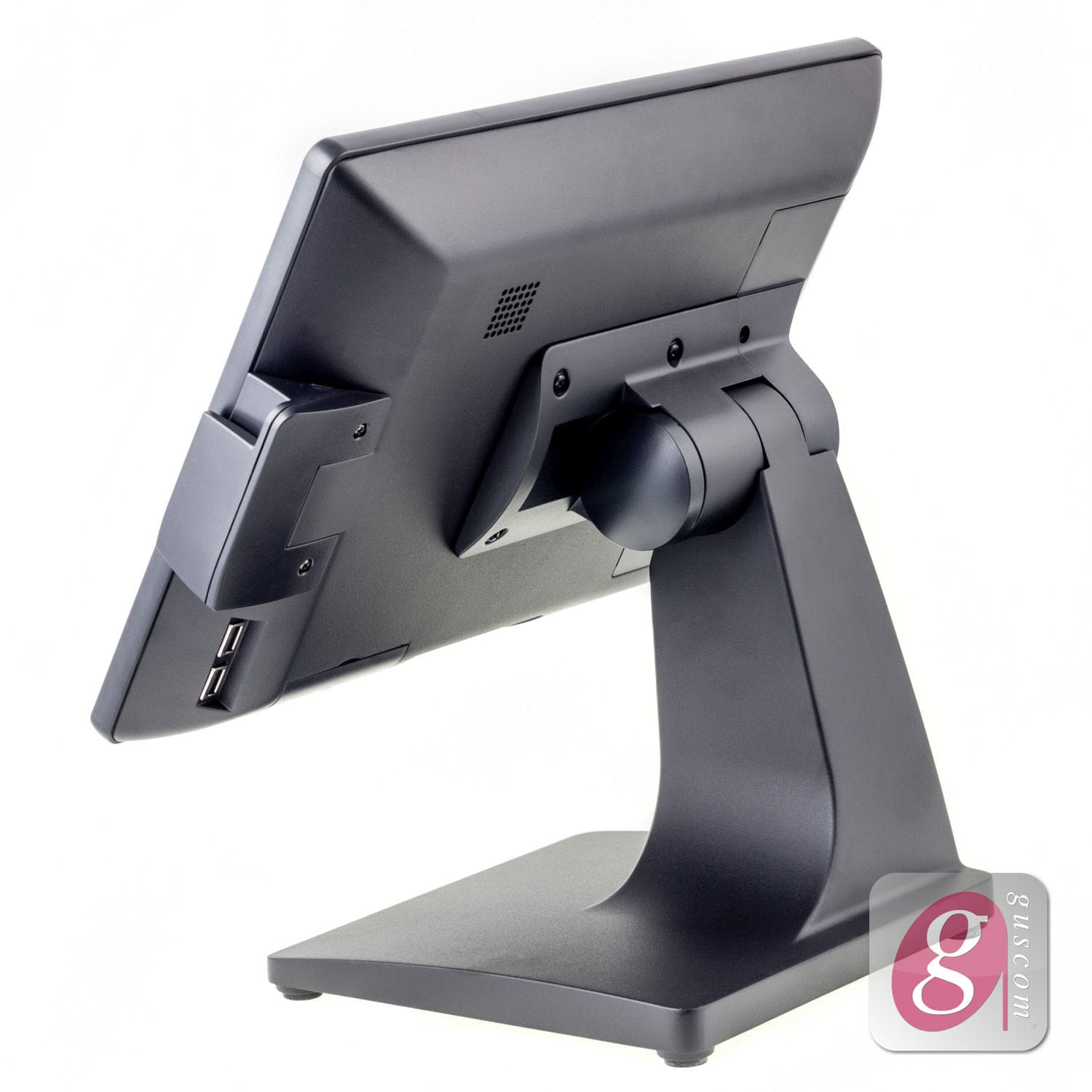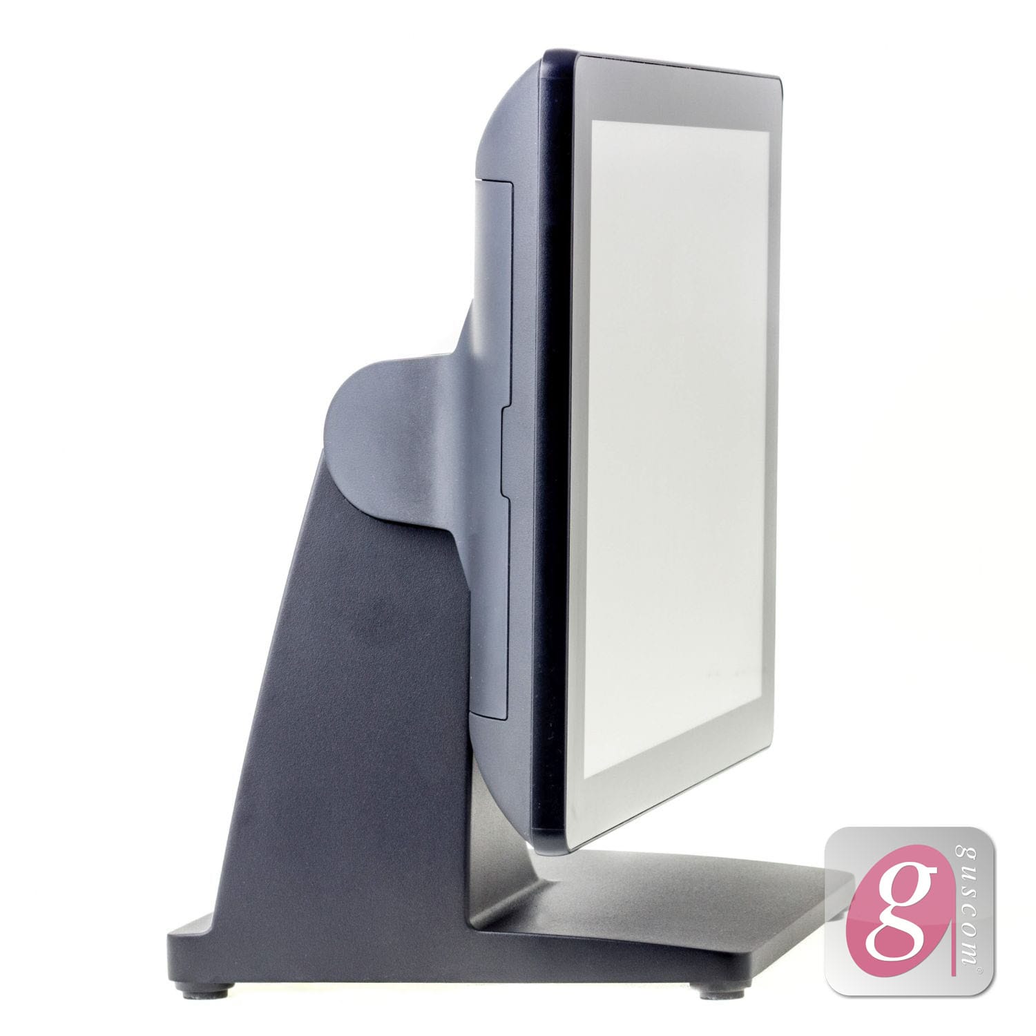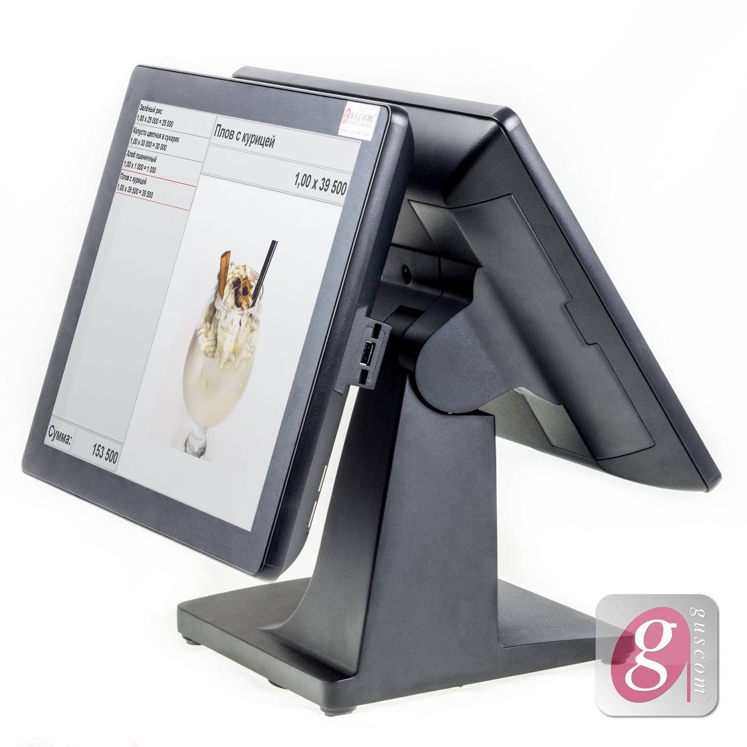 Терминал оборудован 15-дюймовой TN-матрицей с разрешением 1024х768. Яркость экрана составляет 250 cd/m2 и её вполне достаточно для удобной работы даже при ярком освещении, однако при солнечном свете изображение сильно блекнет. Частично спасает матовое антибликовое покрытие. Сенсорное стекло резистивного типа. Это означает, что монитор будет реагировать на нажатия любыми предметами и не бояться попадания влаги, в отличии от ёмкостных экранов. Конструктивно предусмотрено крепление для дисплея покупателя. Монитор для гостей может быть 10, 12 или 15 дюймов. Выполнены они в одном стиле с POS-терминалом и из таких же материалов, а вместо сенсорного дисплея установлено защитное стекло.