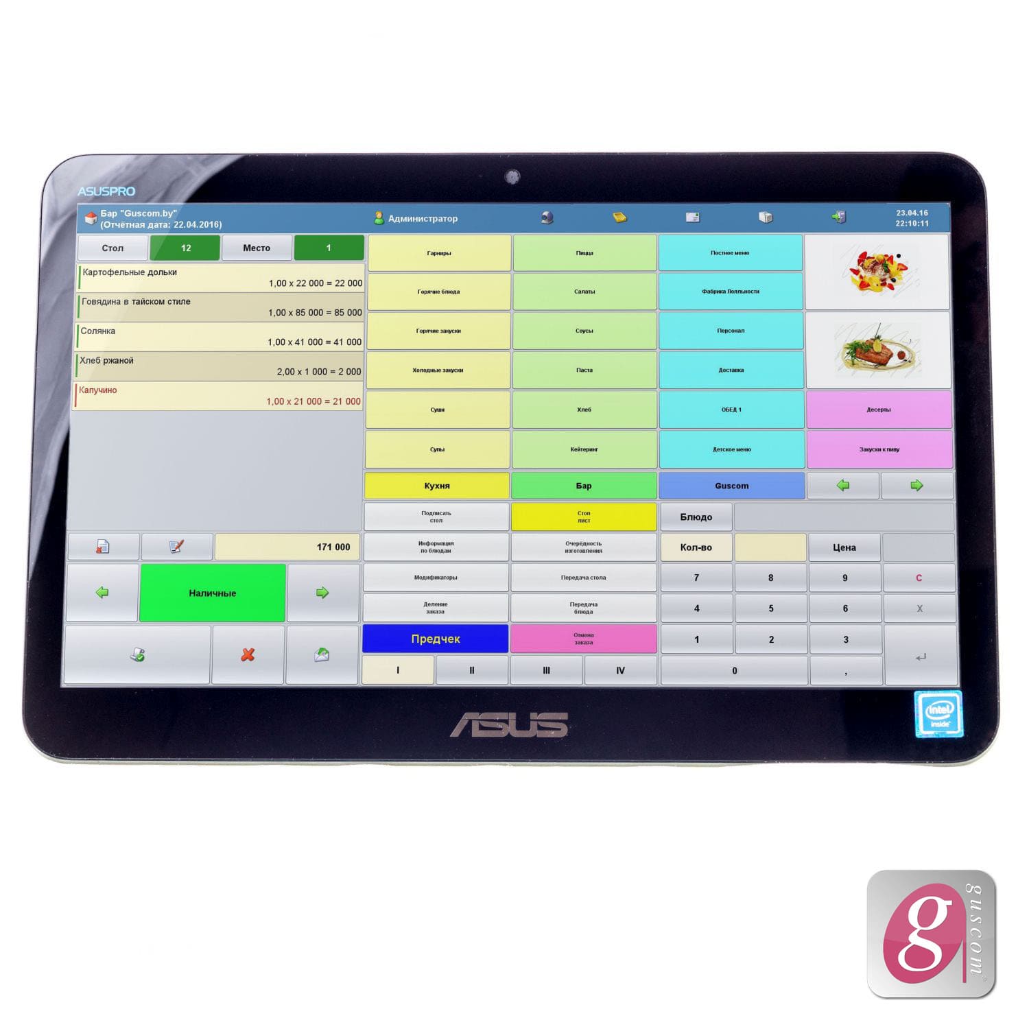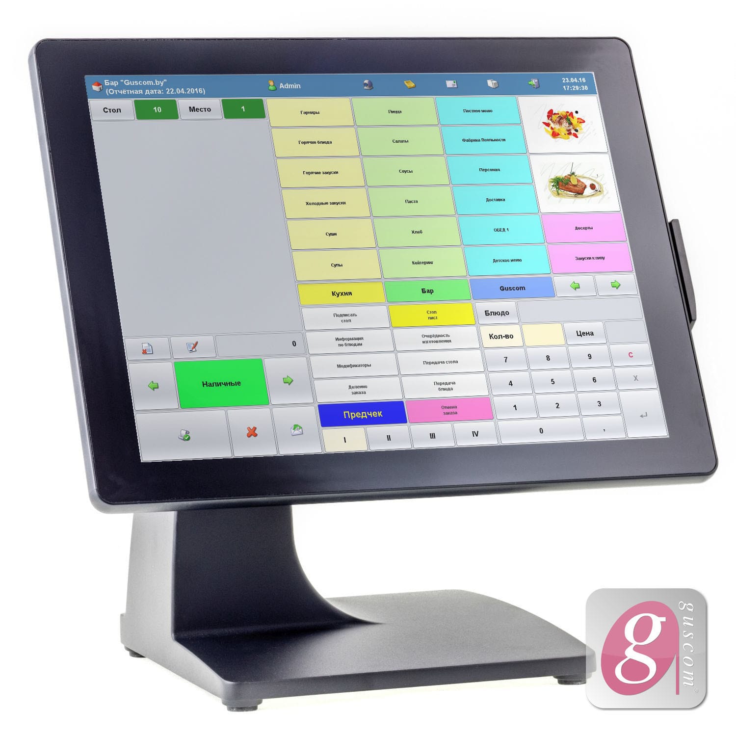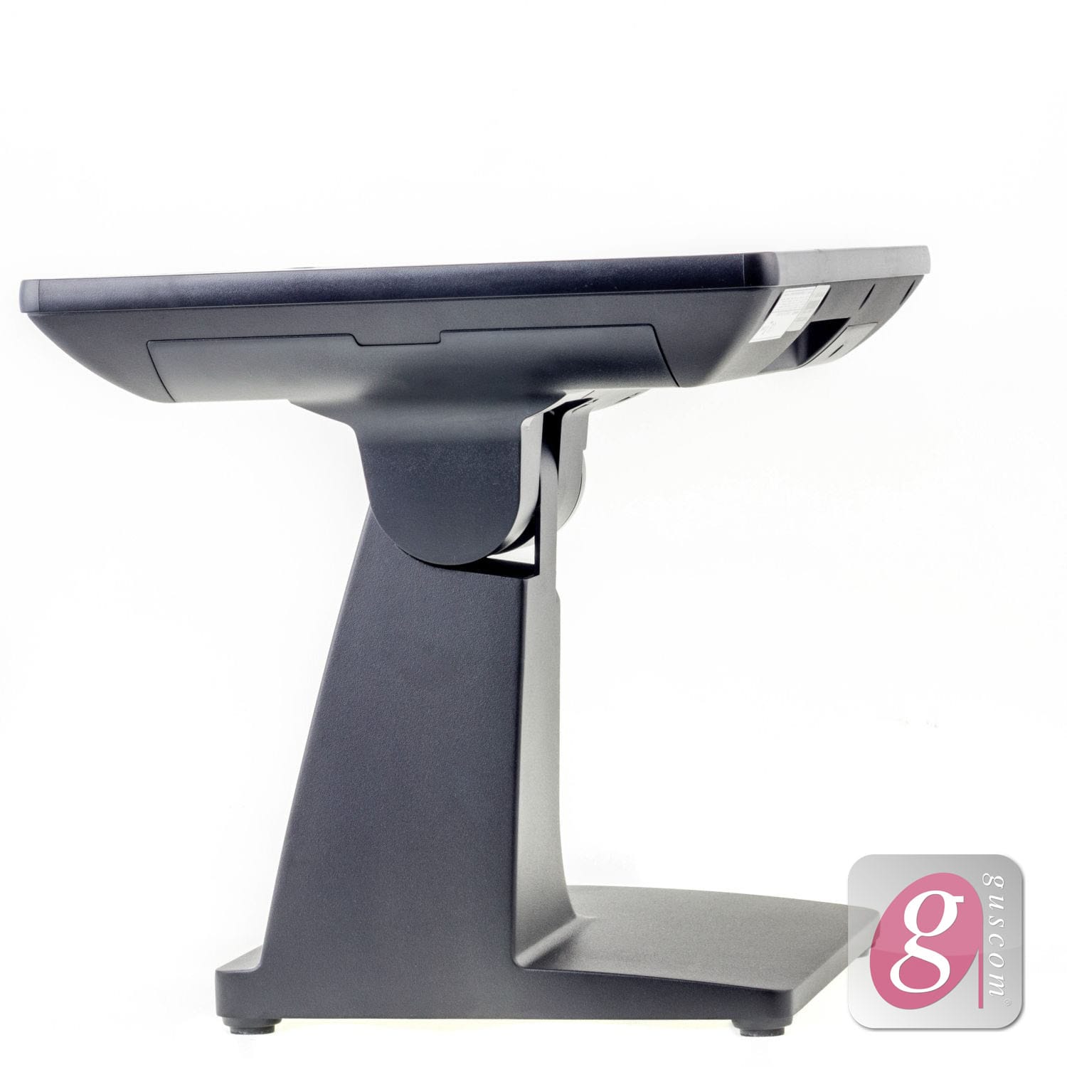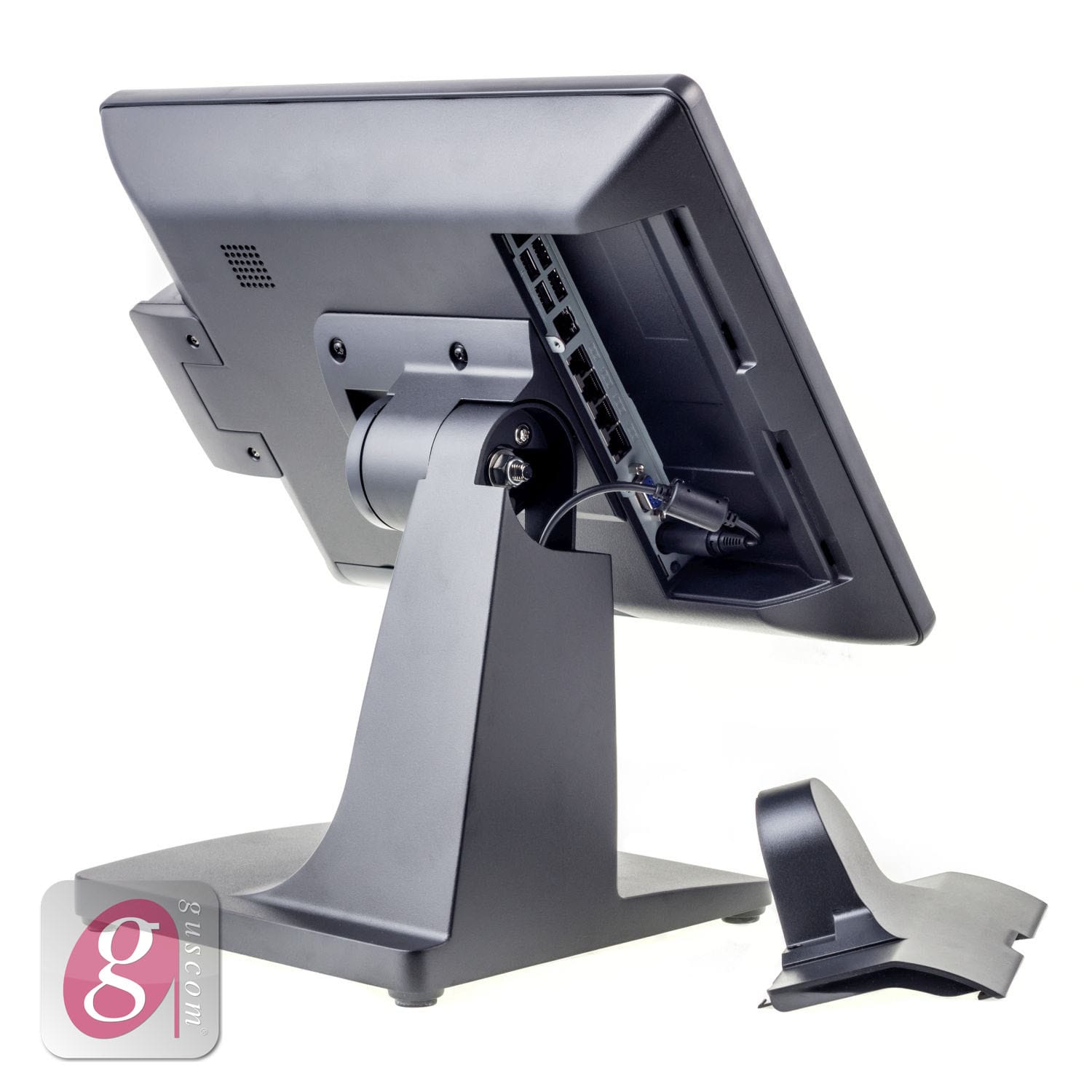 Терминал оборудован 15-дюймовой TN-матрицей с разрешением 1024х768. Яркость экрана составляет 250 cd/m2 и её вполне достаточно для удобной работы даже при ярком освещении, однако при солнечном свете изображение сильно блекнет. Частично спасает матовое антибликовое покрытие. Сенсорное стекло резистивного типа. Это означает, что монитор будет реагировать на нажатия любыми предметами и не бояться попадания влаги, в отличии от ёмкостных экранов. Конструктивно предусмотрено крепление для дисплея покупателя. Монитор для гостей может быть 10, 12 или 15 дюймов. Выполнены они в одном стиле с POS-терминалом и из таких же материалов, а вместо сенсорного дисплея установлено защитное стекло.