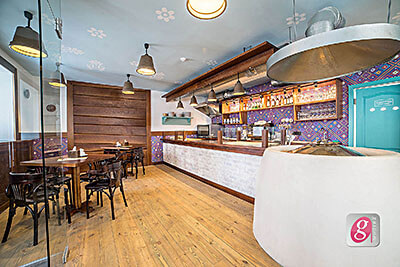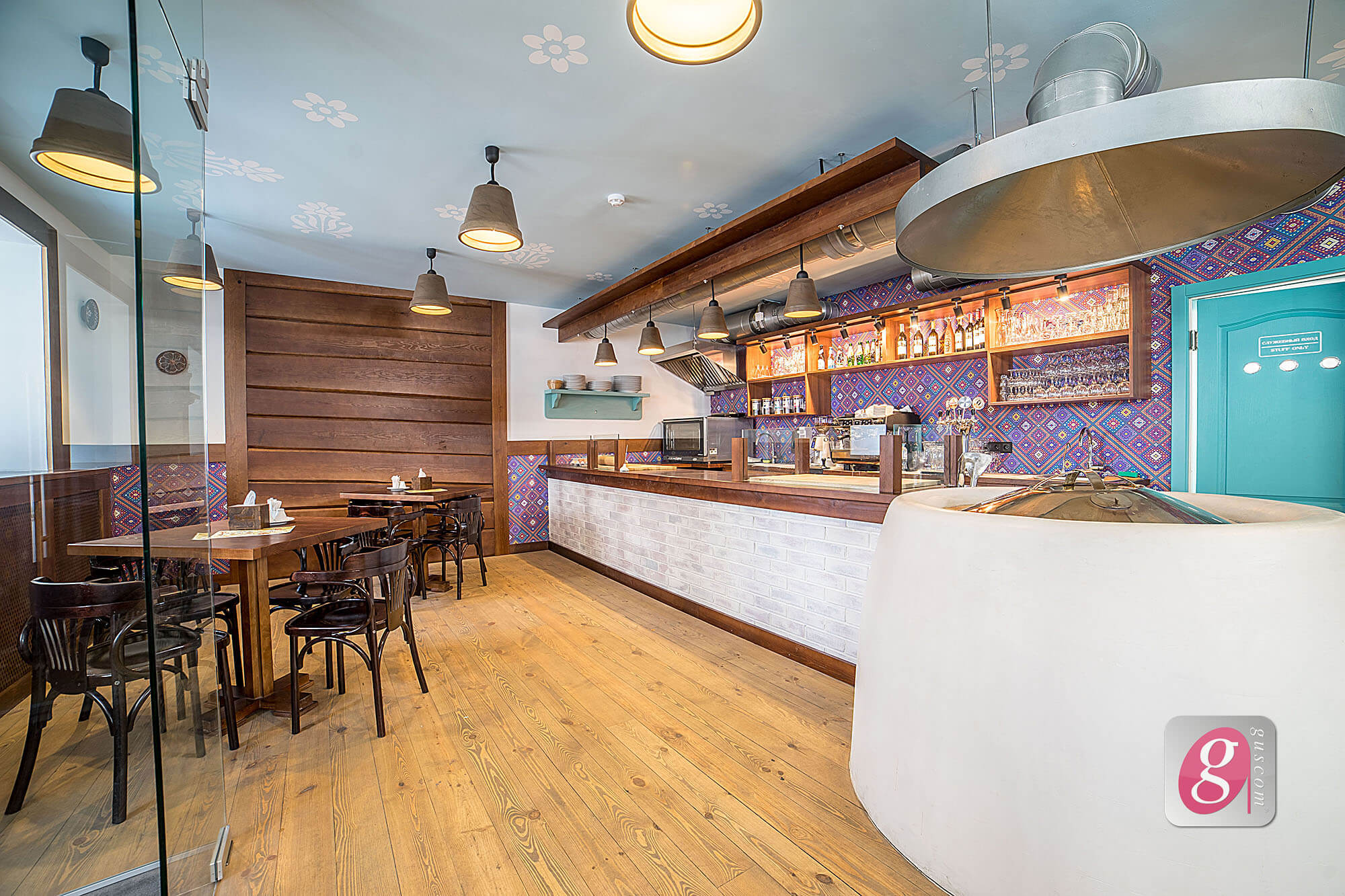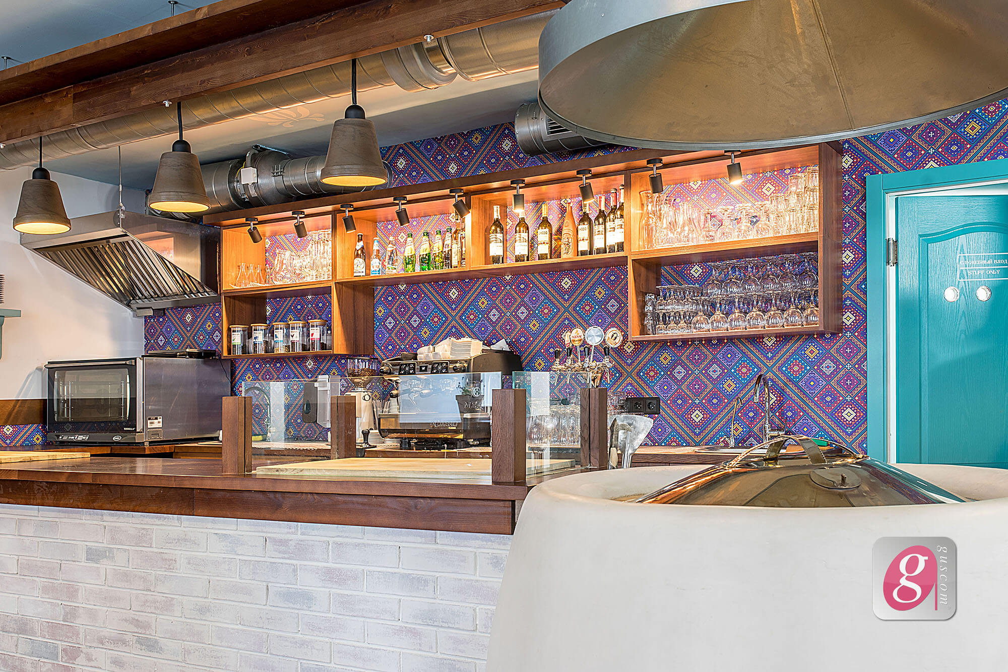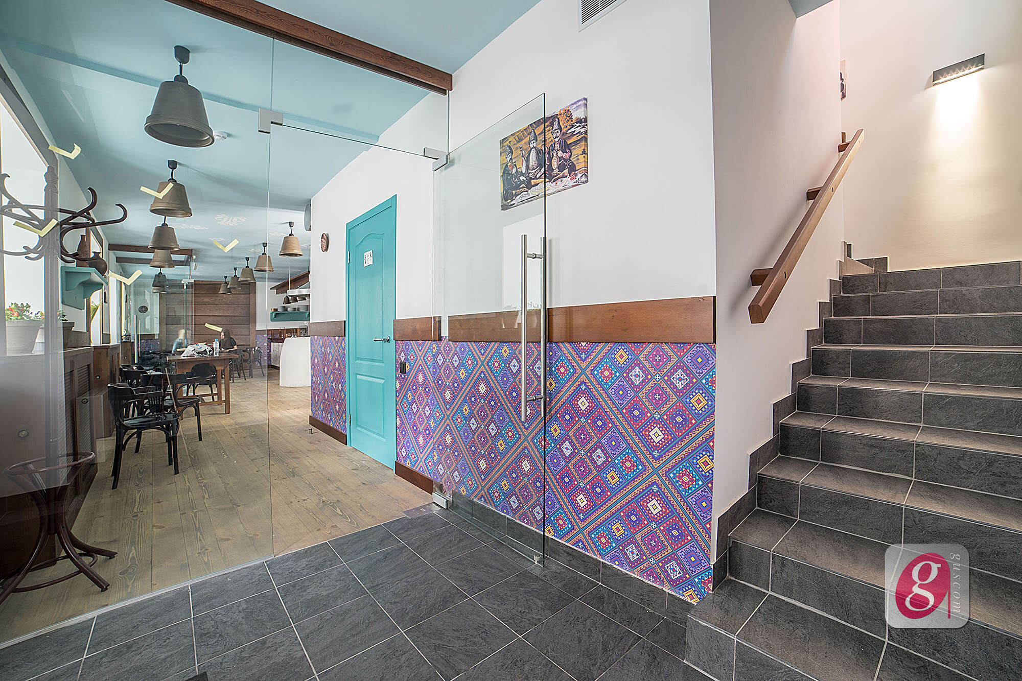 Расположено заведение прямо за Дворцом Республики и занимает два этажа. Первый этаж довольно компактен, так как предназначен в основном для персонала: здесь готовят основные блюда из меню, здесь же выпекают шоти в тандыре, который и находится в открытом помещении. Так что первый этаж для тех, кто кроме вкусной еды еще хочет насладиться запахами, которые то и дело разжигают аппетит в процессе приготовления. Такое приятное ожидание оправдывает себя, поверьте.